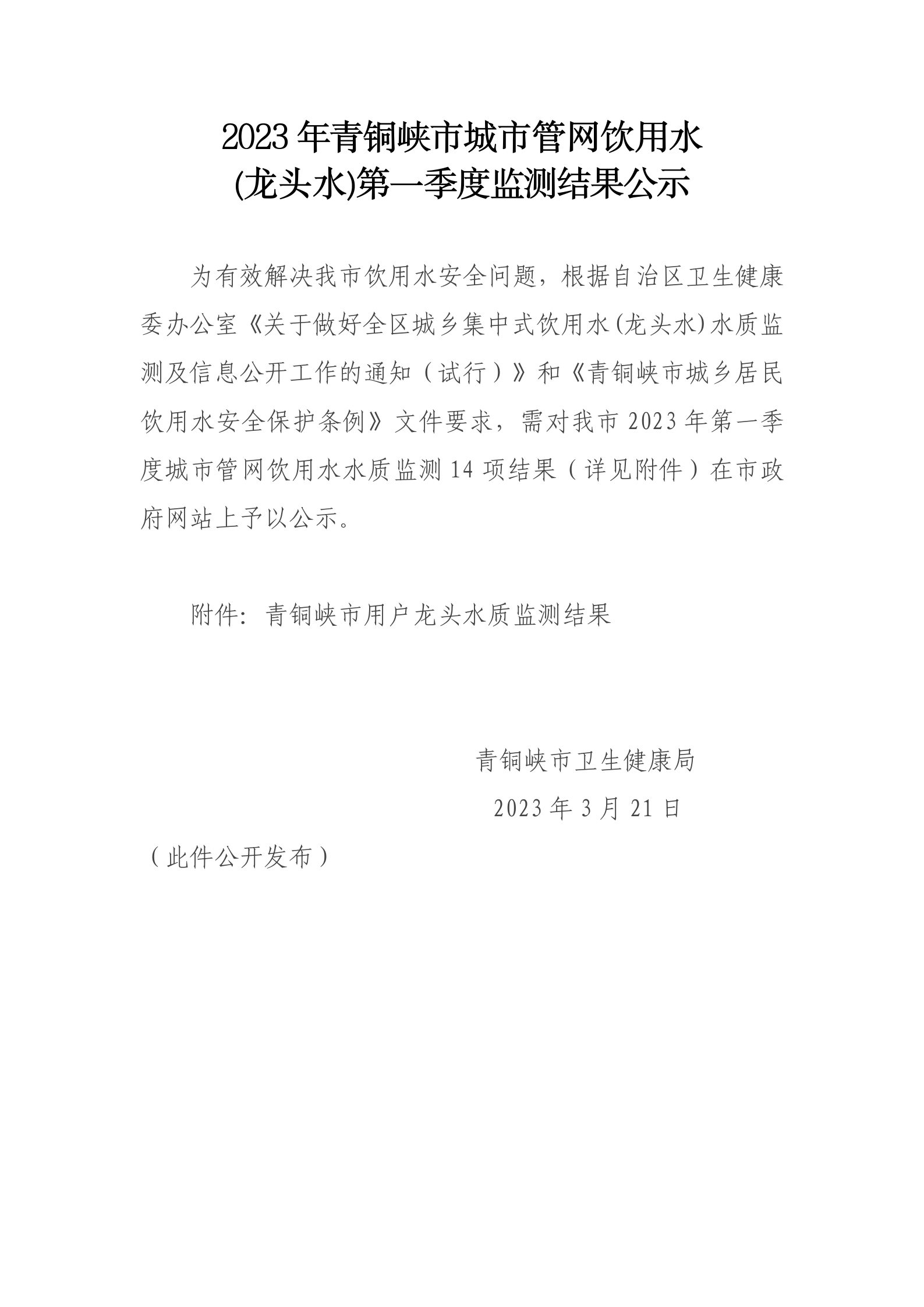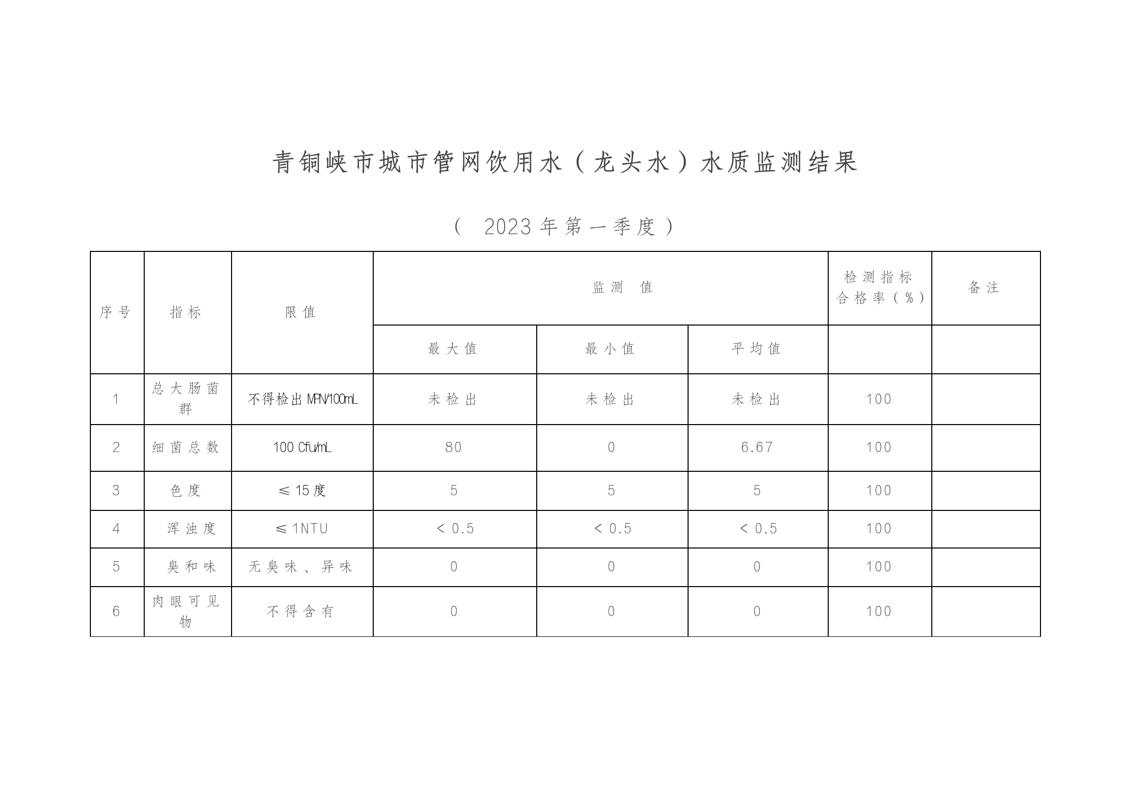 标 题: 2023年青铜峡市城市管网饮用水 (龙头水)第一季度监测结果公示