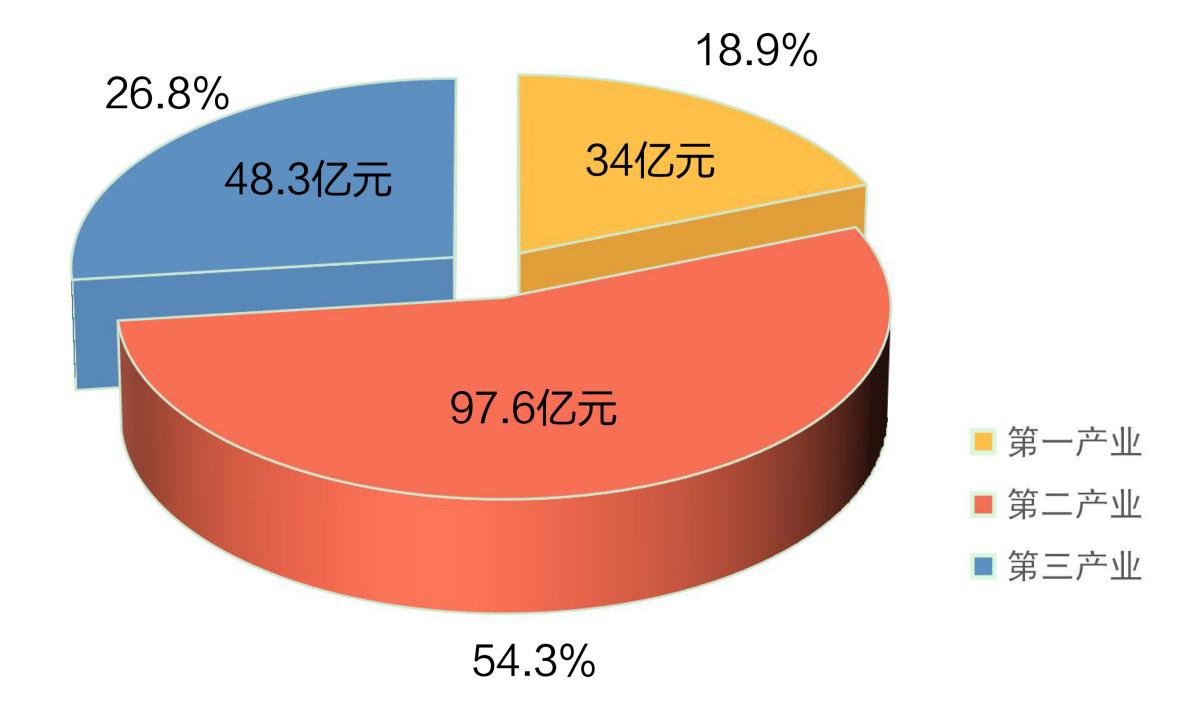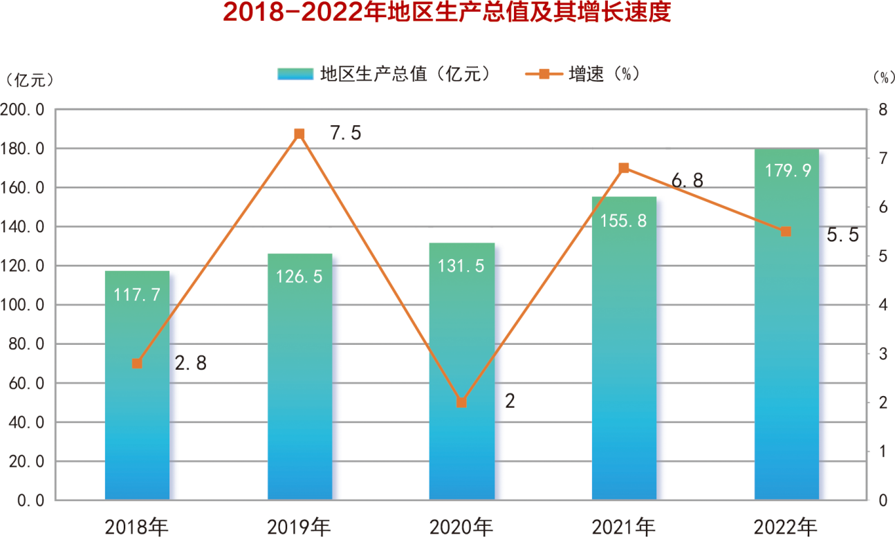 初步核算,2022年全市实现地区生产总值179.9亿元,按不变价计算,比上年增长5.5%。分产业看:第一产业实现增加值34亿元,增长4.3%;第二产业实现增加值97.6亿元,增长8.3%;第三产业实现增加值48.3亿元,增长2.1%。三次产业比例为:18.9:54.3:26.8。按常住人口计算,人均地区生产总值73447元,比上年增长5.5%。
