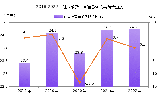 全年实现社会消费品零售总额24.75亿元,比上年增长0.1%。按经营地统计,城镇市场实现社会消费品零售额19.67亿元,下降1%;农村市场实现社会消费品零售额5.07亿元,增长4.6%。分行业看,批发业消费品零售额7.07亿元,下降0.9%;零售业消费品零售额12.77亿元,增长1%;住宿业消费品零售额0.24亿元,下降15.6%;餐饮业消费品零售额4.67亿元,增长0.2%。分规模看,限额以上企业消费品零售额5.97亿元,下降10.44%,限额以下实现消费品零售额18.78亿元,增长3.99%。
