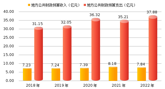 全年完成地方公共财政预算收入7.84亿元,比上年下降4.2%。其中:税收收入完成4.9亿元,占比62.6%;非税收入完成2.9亿元,占比37.4%。地方公共财政预算支出37.88亿元,比上年增长7.6%。
