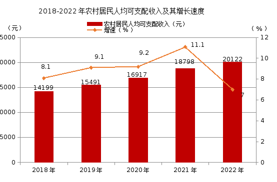 全市农村居民人均可支配收入20122元,同比增加1323.8元,增长7%。 从收入构成看,农村居民人均工资性收入10306.2元,增长7.8%;人均经营净收入8592.7元,增长6%;人均财产净收入381.7元,增长8.7%;人均转移净收入841.4元,增长7.1%。