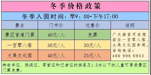 受气温和季节的影响,青铜峡黄河大峡谷旅游区从2019年11月27日至2020年3月1日,调整游览线路并执行冬季价格,游客可自驾前往一百零八塔、大禹文化园参观,冬季价格执行如下: