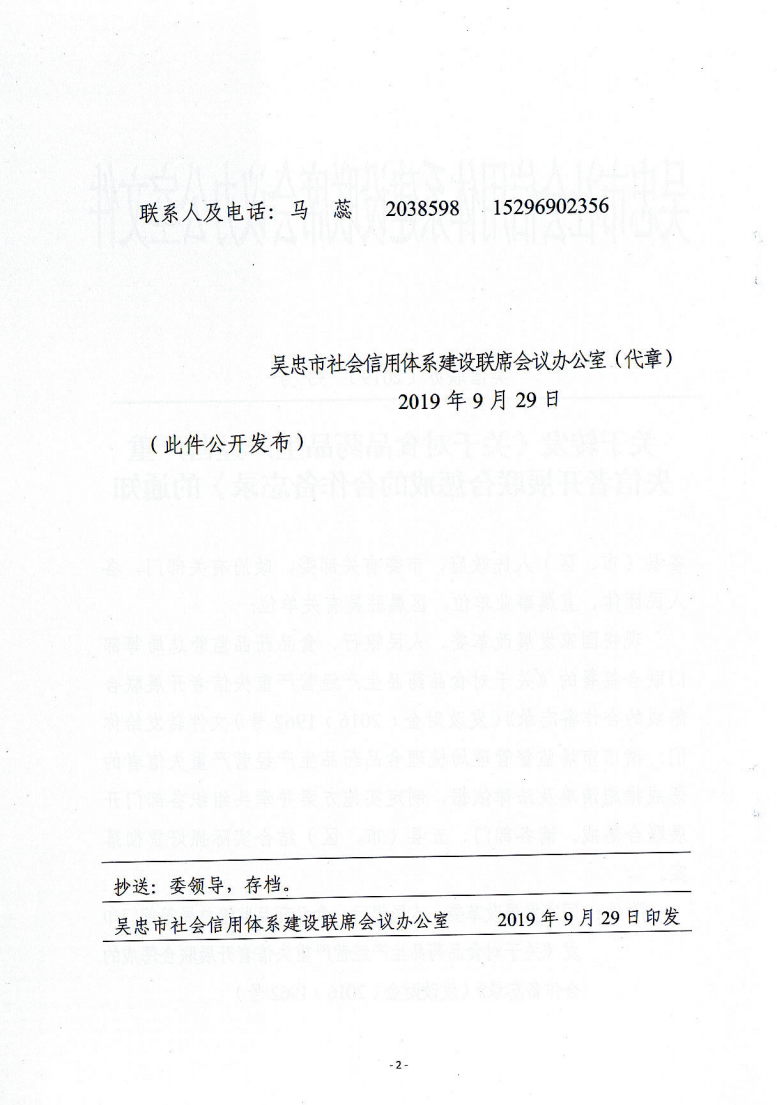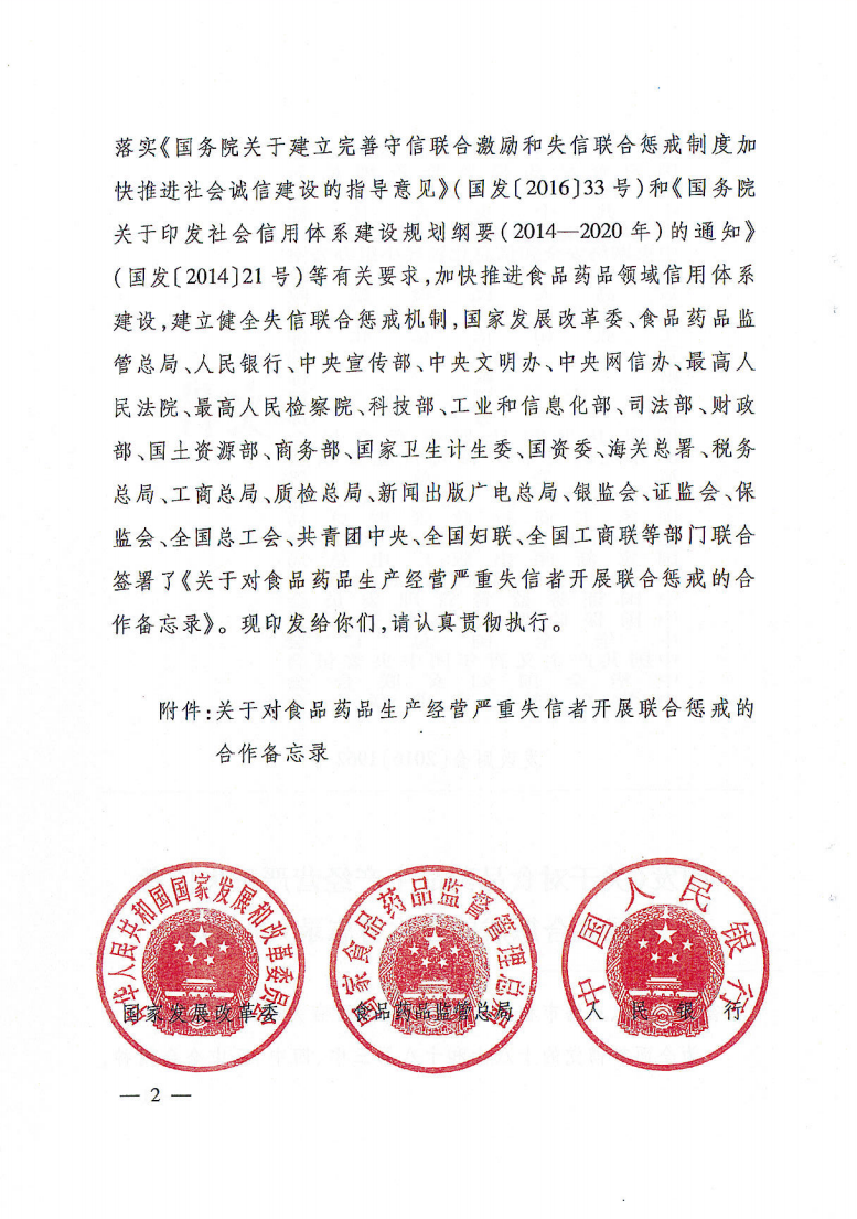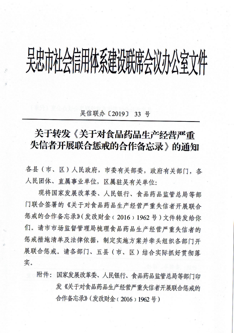 青铜峡市关于转发《关于对食品药品生产经营严重失信者开展联合惩戒的合作备忘录》的通知