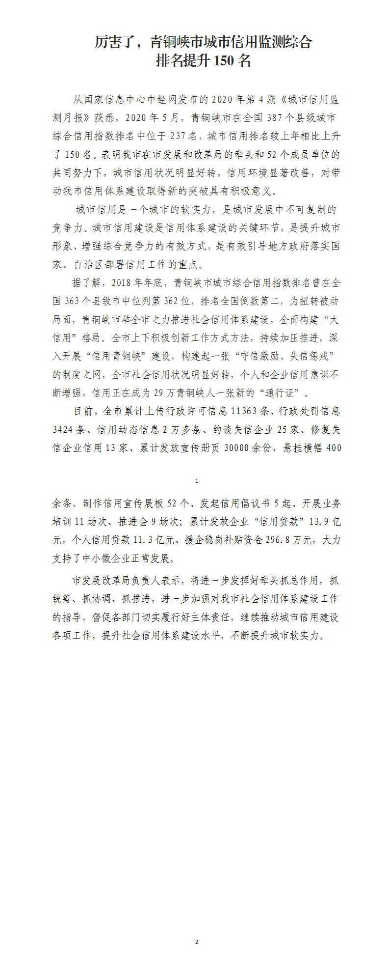 厉害了,青铜峡市城市信用监测综合排名提升150名